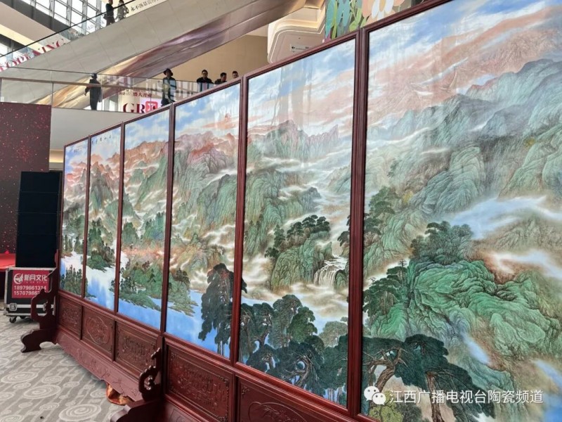为策应瓷博会主题,积极努力响应景德镇市委市政府推动陶瓷文化发展战略构想,作为本届瓷博会的配套活动,《江山胜景图》全球首发仪隆重举行。《江山胜景图》是目前世界上最大的单幅陶瓷巨作,长10.71米、高4.5米,并且制作工艺采用了釉下高温颜色釉结合釉上青绿粉彩的艺术表现形式,通过中国独有的水墨山水绘画技艺进行表现,其器宇宏阔、工艺精益、烧制维艰,是当代陶瓷工艺制作及绘画的最高水平,又一次刷新了中国陶瓷工艺制作的全新纪录。