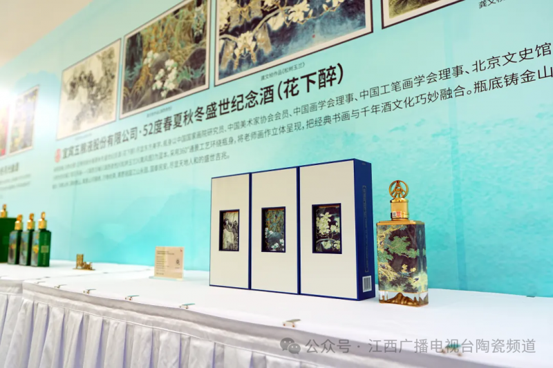 雅集当日“创作笔会”现场的文化展区,展出多款五粮液系列文化酒,包括《五粮液股份春夏秋冬月光曲酒》《五粮液股份春夏秋冬盛世纪念酒(花下醉)》、《五粮液股份五粮文创丝路瓷韵纪念酒》《五粮液股份五粮文创盛世和美纪念酒》等,体现“瓷画合一”的艺术理念。书画名家在创作间隙驻足交流,对瓷、酒、画融合的创新实践给予高度评价,认为其延续了中国文人“诗酒画瓷一体”的传统精神。